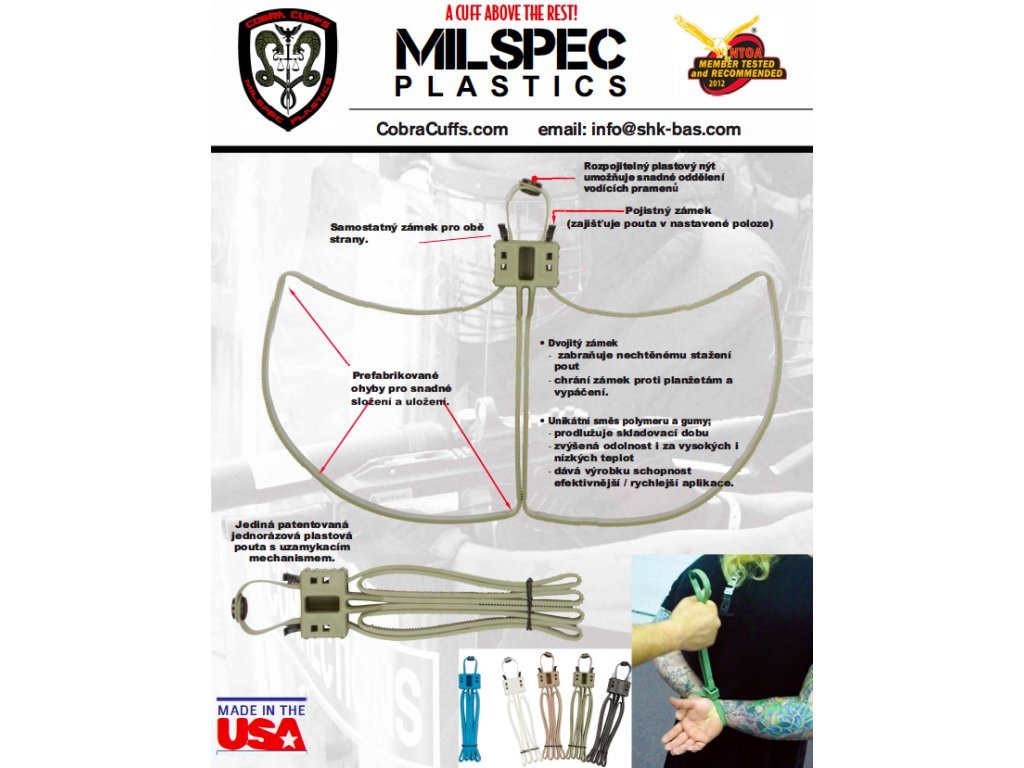 Cobra Cuffs jsou jednorázová plastová pouta. Mají jedinečný patentovaný uzamykací mechanismus s dvojitým pojistným zámkem. Tento zámek chrání pouta proti planžetám nebo páčení a zvyšuje, tak bezpečnost uživatele při manipulaci s pachatelem. Pojistný zámek také umožňuje uzamknout pouta v nastaveném rozsahu a zabraňuje tak nechtěnému stažení pout, které u standardních pout často nutí uživatele pouta pachatelům odebrat a nasadit nová. Stahovací prameny pout jsou na konci spojeny plastovým nýtem. Po jeho rozpojení je možné vést pachatele ve dvou osobách.